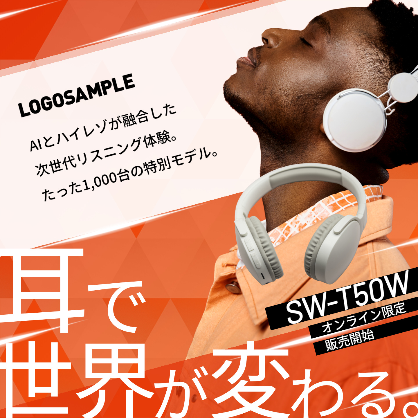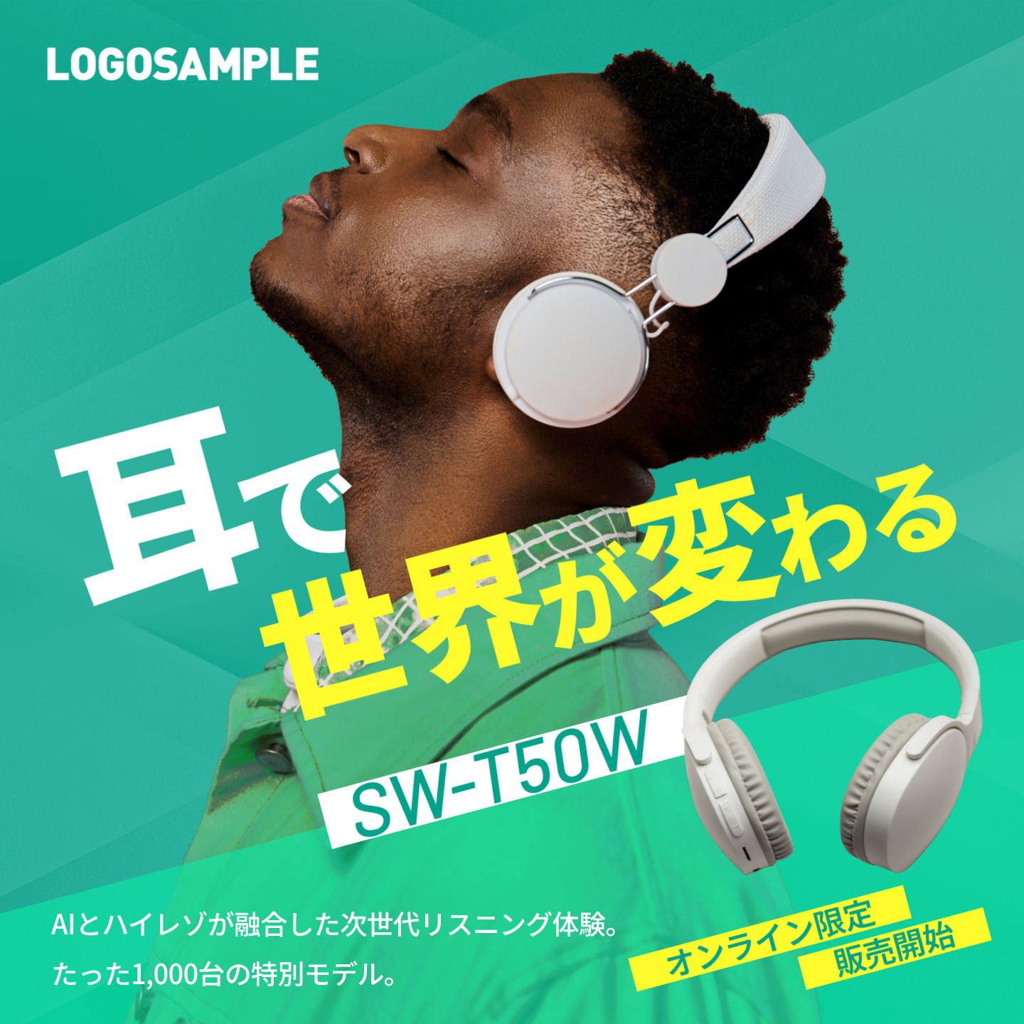 疾走感のある装飾が印象的なデザインで、背景色を変えることでイメージを自在にアレンジでき、キャッチコピーを大きく見せたい広告にぴったりのフォーマットです。